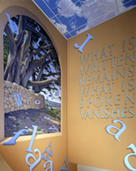 Ocean View Library, San Francisco by John Wehrle. “Words Fly Away” Incised Text and Painting (Photo © 2004 Said Nuseibeh) |