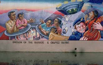“Division of the Barrios and Chavez Ravine” 1983 by Judy Baca, segment of the Great Wall mural in Los Angeles, USA (1940s - 1950s, Section 3). Sponsored by SPARC. (Photo Great Wall Images © Judy Baca 1976-2001) |