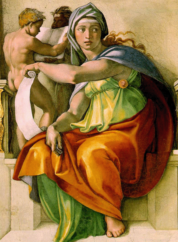 The Delphic Sibyl is renowned for her ideal beauty. Her expression here is one of surprise as she turns in the opposite direction while the characters behind her remain unmoved. The animation is portrayed as a temporary interruption and partial surge of energy while the rest of her body remains calm. |